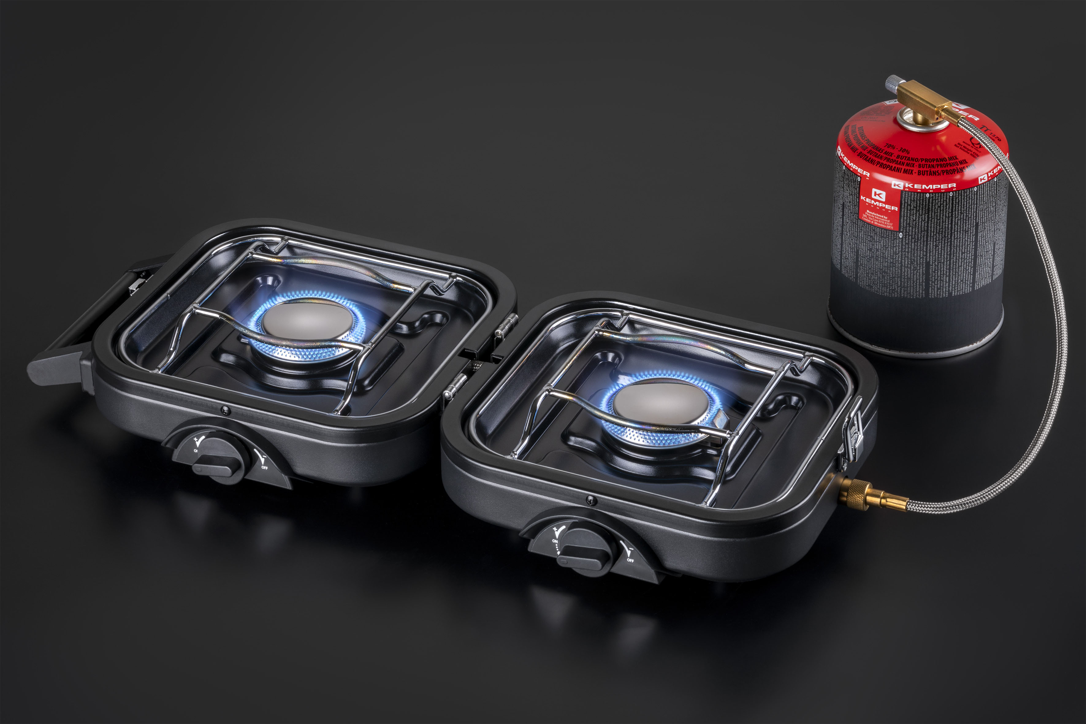 High pressure cooker with 2 stainless steel burners for kemper butane/propane cartridges 1121F and 1126F46. Integrated piezo ignition and carrying handle. Direct connection to cartridges – No regulator required