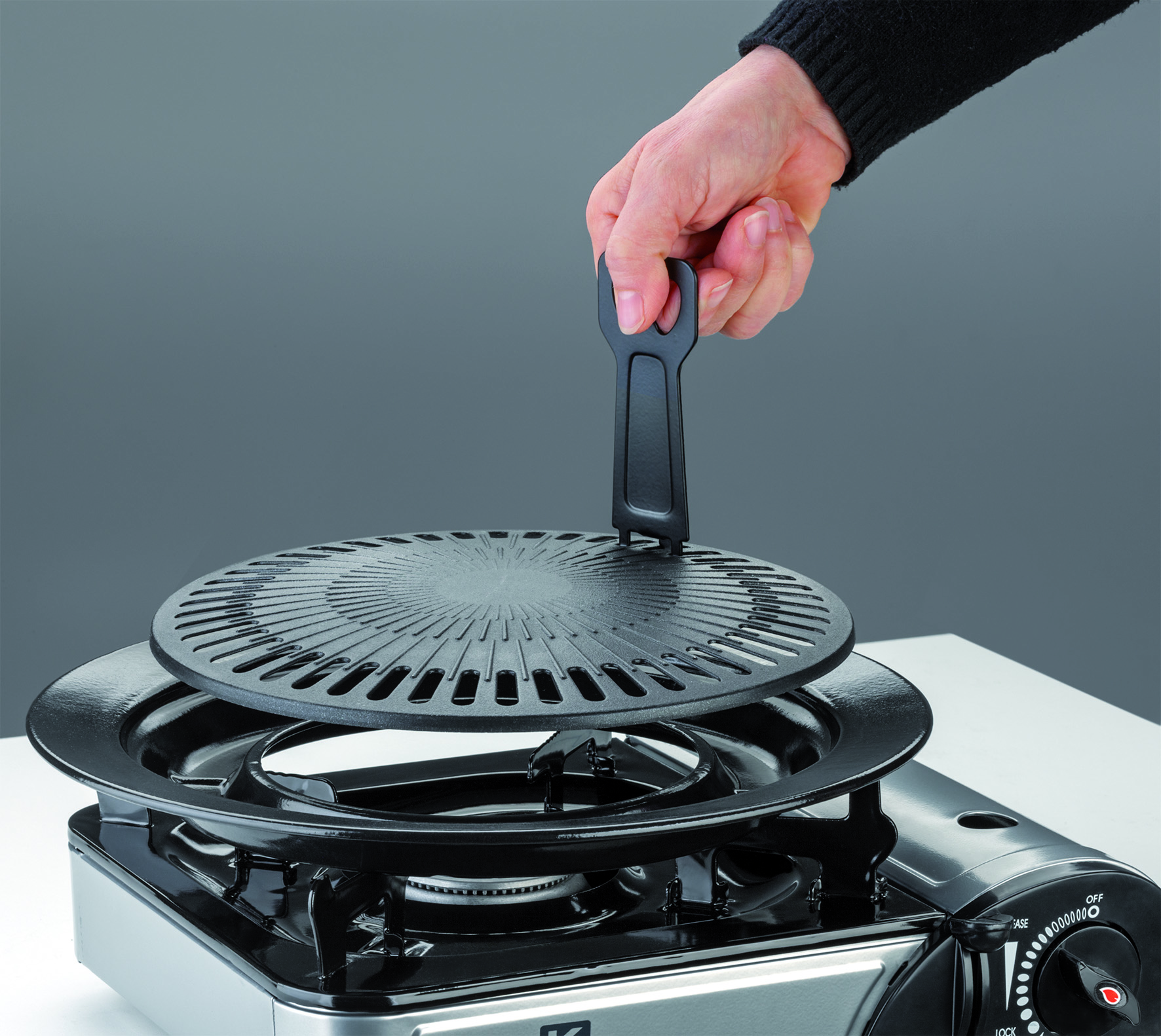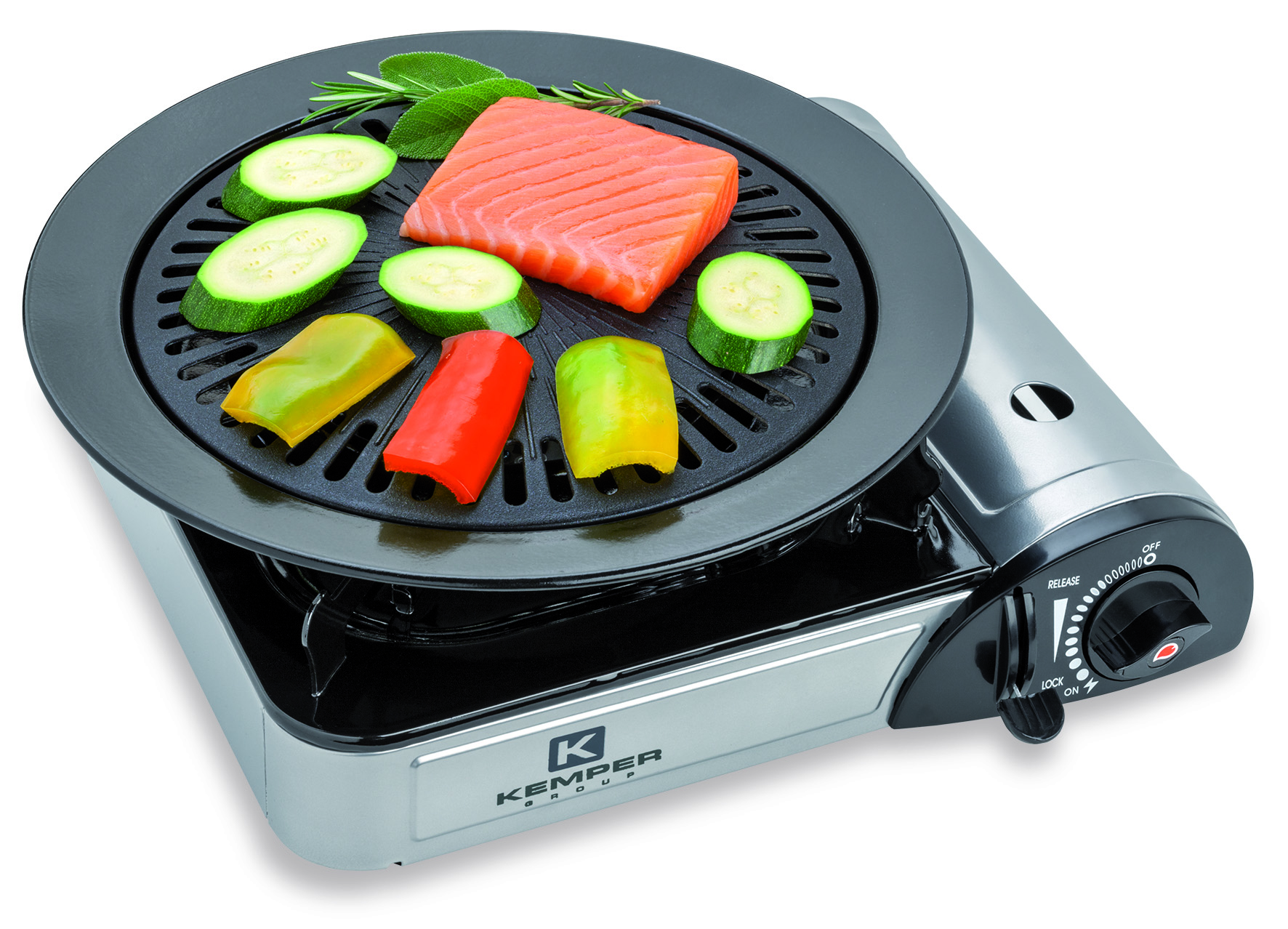 Piastra con copertura antiaderente, con vassoio raccogli grassi e gancio per consentire il sollevamento. Ideale per grigliare in campeggio e all’aria aperta. Utilizzabile su fornello SMART 104987 ed XTRA SMART 104987SS