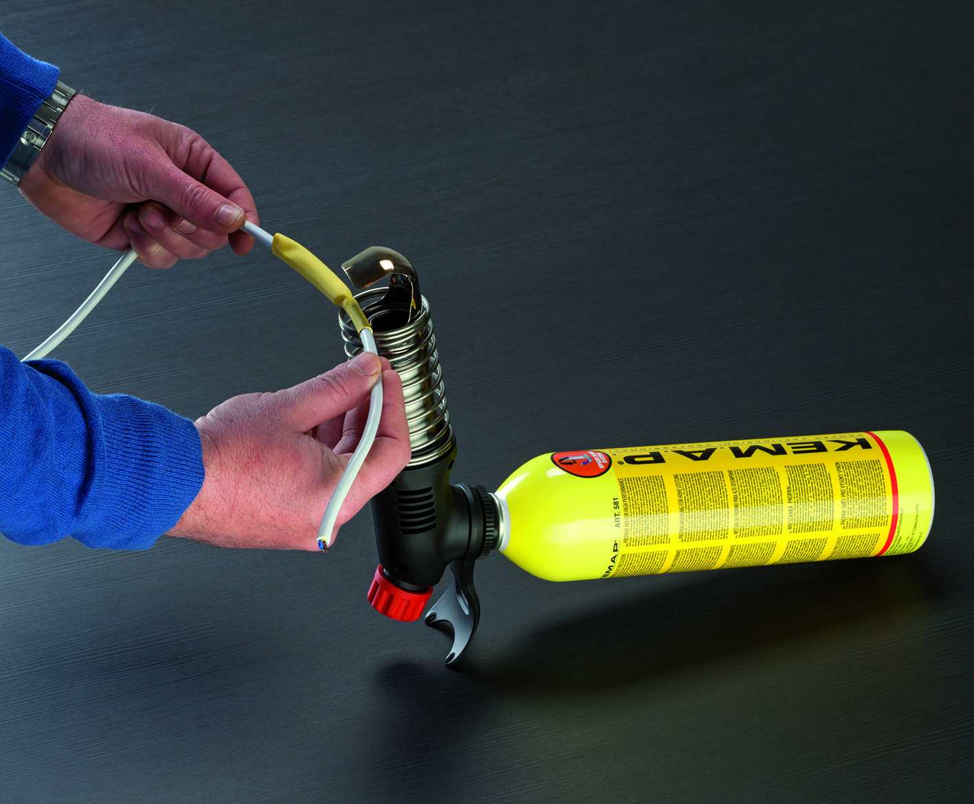 Kit with gas hot air gun, KEMAP 581 cartridge, nozzle for thermotetrating and nozzle for channeling hot air flow. Power 0.56 kW. Piezo electric ignition. 7/16″ threaded connection. Includes protective spring for hot parts and integrated support for hands-free use of the equipment. Ideal for heat shrinking, heating, paint stripping. Can also be used with valved cartridges art. 575, 580, 580S, 581,581N, 1121F, 1126F46 .