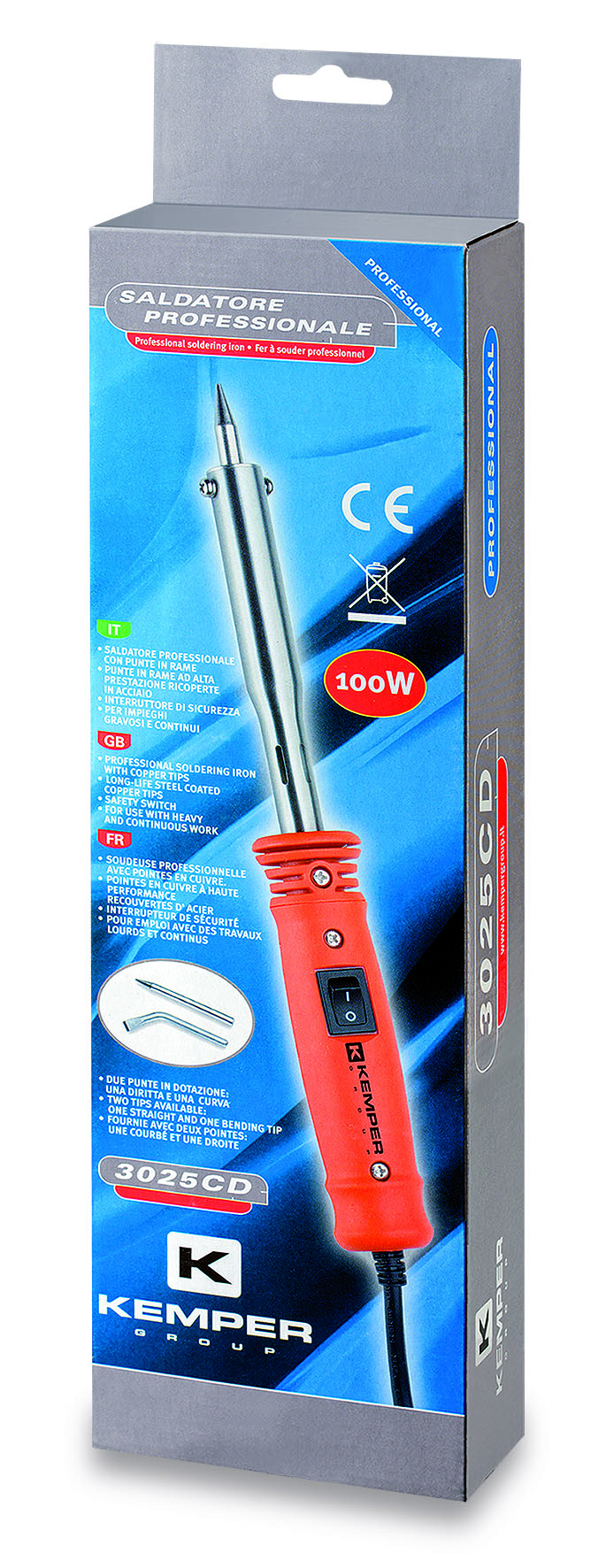 Saldatore per stagnatura professionale . Interruttore acceso /spento. Adatto alla stagnatura professionale con impieghi gravosi e continui. Kit di due punte in rame diam. 5,8 mm. curva e diritta incluse nella confezione.