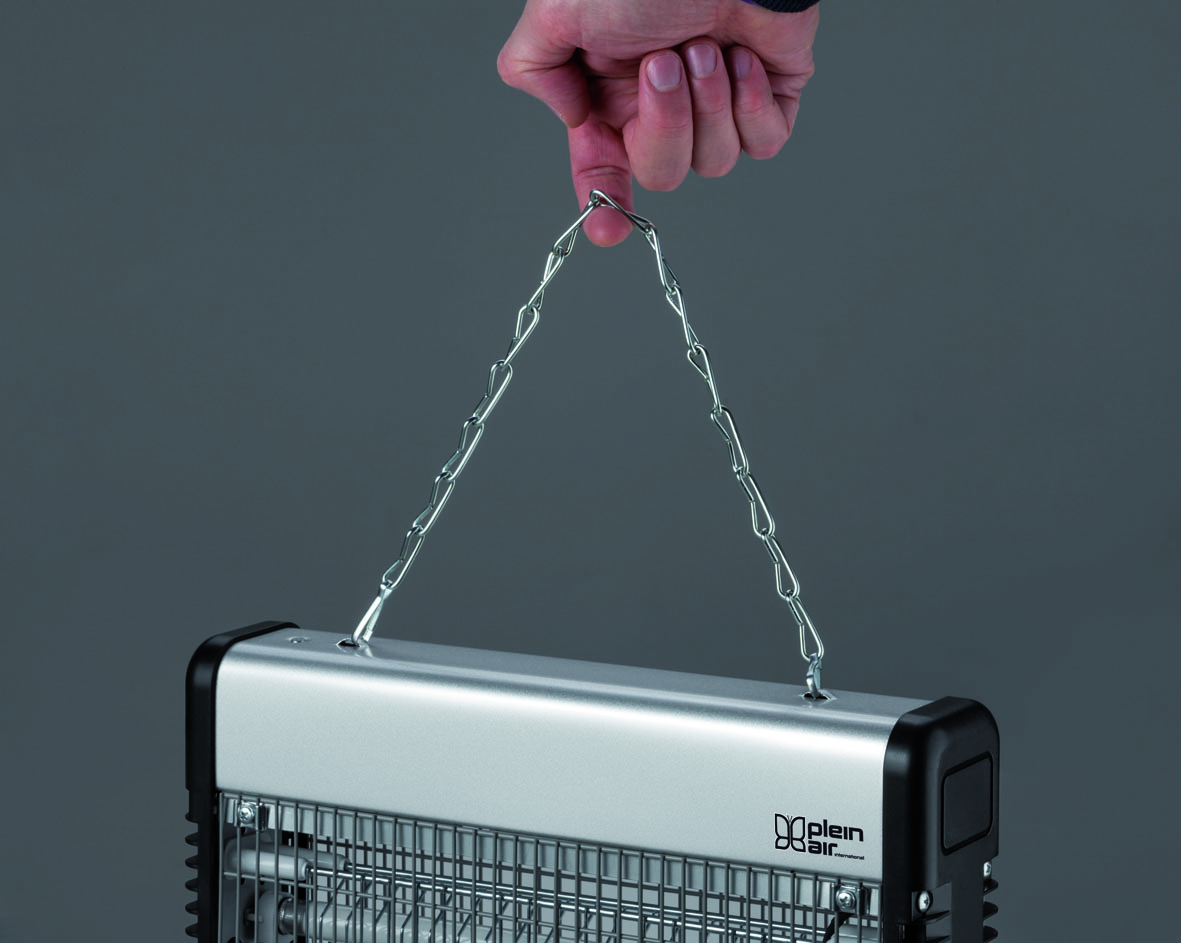 Moustiquaire à décharge électrique 3000 V équipée de 2 lampes actiniques de 6W. Couleur : gris métallisé. Idéal pour éliminer les moustiques et les insectes dans un rayon d’action de 30 m². Equipé d’un tiroir de collecte d’insectes amovible et d’une chaîne de suspension pour une utilisation suspendue.