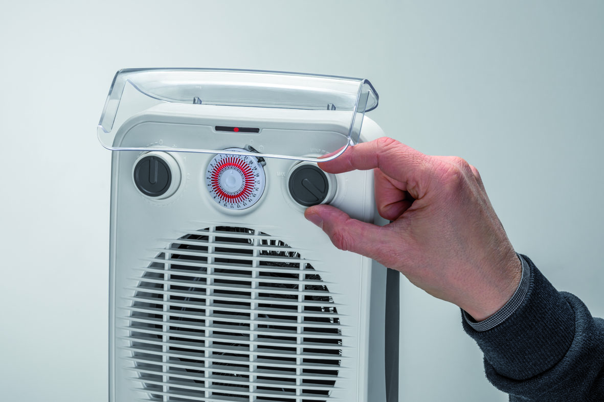 Termoventilatore elettrico 2000W, provvisto di timer 24 ore, termostato ambiente regolabile, termostato di sicurezza antisurriscaldamento, pannello di controllo protetto da sportello, 2 livelli di potenza(1000W/2000W), manopole di selezione comandi e maniglia posteriore. Livello di protezione IP21.Ideale per riscaldare appartamenti, sale da bagno, negozi, uffici, sale d’aspetto e tutti quegli ambienti dove sia necessaria una fonte di calore ed uno stile moderno. Area di copertura 20 m².Il timer 24h permette la programmazione automatica dell’accensione e dello spegnimento. Lo sportellino anti goccia, che protegge l’area comandi, ne permette l’utilizzo negli ambienti umidi in tutta sicurezza.